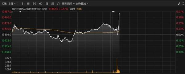 富时中国A50指数期货在上一交易日夜盘收涨0.15%的基础上高开,盘中直线拉升。