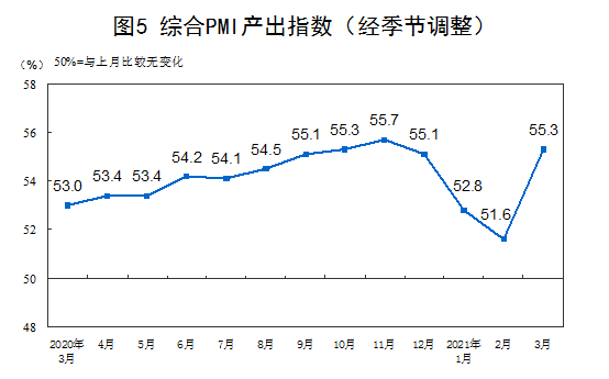 3月份,综合PMI产出指数为55.3%,比上月上升3.7个百分点,表明我国企业生产经营活动总体加快。