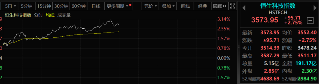 然而,今天早盘,香港市场的表现却非常好。恒指和国企指数涨幅一度超过2%,恒生科技指数表现更强。A50的表现亦明显强于A股。