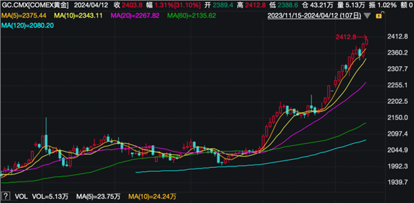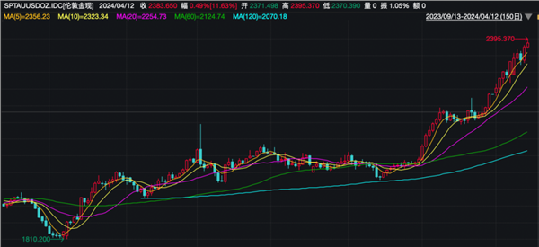 Wind行情数据显示,伦敦金现昨日收涨1.63%,报2372.016美元/盎司,再创历史新高。不过,随着今日开盘,该纪录再次被刷新,今日盘中,伦敦金现一度冲至2395.37美元/盎司。COMEX黄金走势亦相近,在今日盘中冲高至2412.8美元/盎司,再次刷新历史纪录。