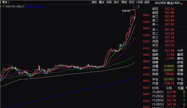 期货市场方面,上海期货交易所黄金期货主力合约报价最高达到568.88元/克。