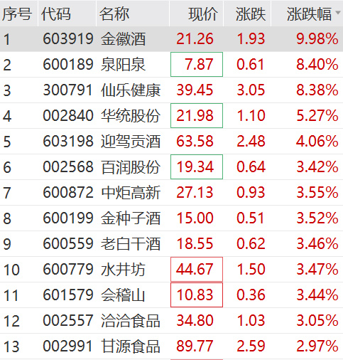 另外,上午食品饮料盘中走高,白酒股整体回暖。金徽酒绩后强势涨停封板,迎驾贡酒、金种子酒、水井坊、老白干酒等多股均有明显涨幅。