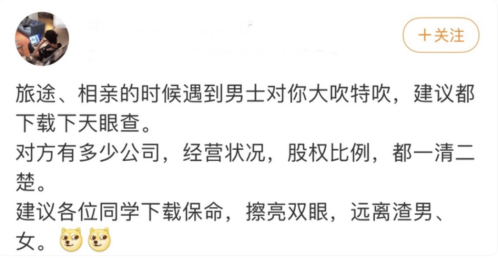 有博主分享,“女孩谈恋爱有三看,要登录天眼查,一看他注册公司的情形,二看是否有案件,三看是否有失信被执行(老赖)”。