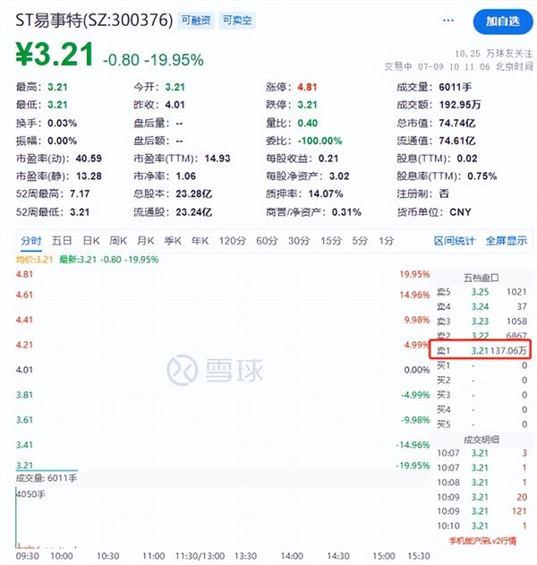 停牌一日后,被实施“其他风险警示”的ST易事特今日在集合竞价阶段即跌停,开盘后继续保持一字跌停状态。截至发稿,ST易事特股价为3.21元/股,跌幅为19.95%,卖一超137万手。