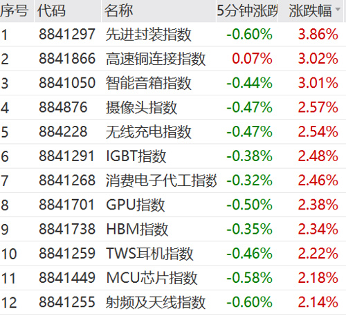盘面上,上午消费电子、半导体、通信设备、贵金属等板块存在局部行情,智能音箱、摄像头、先进封装等板块活跃;建材、教育、农业等板块下挫,CRO、光伏逆变器、减肥药、鸡产业等概念跌幅居前。