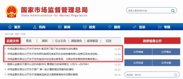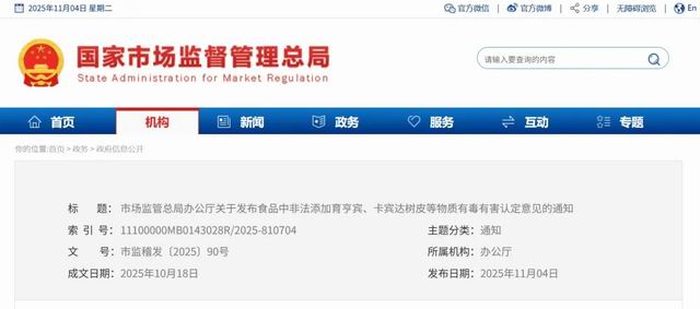 11月4日,国家市场监督管理总局批量发布关于非法添加非食用物质系有毒有害认定意见及执法检验方法的通知。