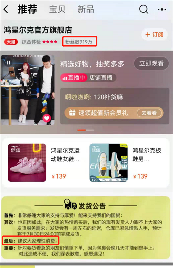 最新数据显示,鸿星尔克淘宝旗舰店粉丝突破900万,首页表示由于发货人力跟不上,会有一周左右的延迟。还特别建议大家理性消费。