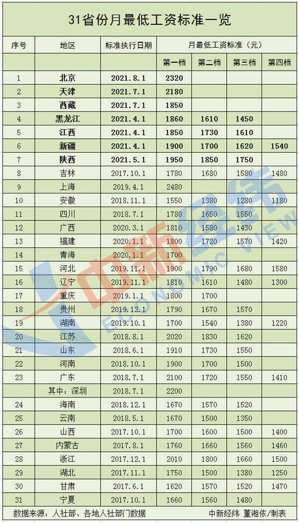 截至目前,上海、北京、广东、天津、江苏、浙江6省份的第一档月最低工资标准超过2000元。其中,上海最高为2480元。
