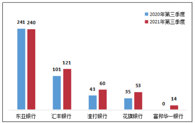 消费投诉方面,东亚银行在外资法人银行中也比较多。自银保监会关于2021年第三季度银行业消费投诉情况的通报显示,2021年前3季度,东亚银行投诉量均位列外资法人银行第一,其中,绝大多数投诉为涉及信用卡业务投诉。