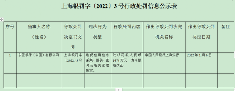 最新信息显示,东亚银行因违反信用信息采集规定被罚1674万。事实上,这并非东亚银行近年首次领千万级罚单。