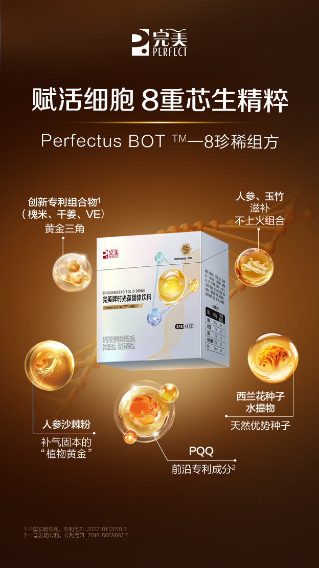 在核心配方研发上,完美时光葆专研Perfectus BOT?-8珍稀组方,精准复配PQQ(吡咯并喹啉醌二钠盐)、西兰花种子水提物、人参沙棘粉等8种核心原料,为消费者保持活力提供多方面守护。其中,PQQ作为前沿专利成分,具有赋活线粒体、促进细胞再生的功效;西兰花种子水提物富含萝卜硫素,能有效保护细胞免受损伤;人参沙棘粉则被誉为“植物黄金”,实现补气固本的天然滋养,8种原料协同作用,实现从根源上焕活细胞活力。