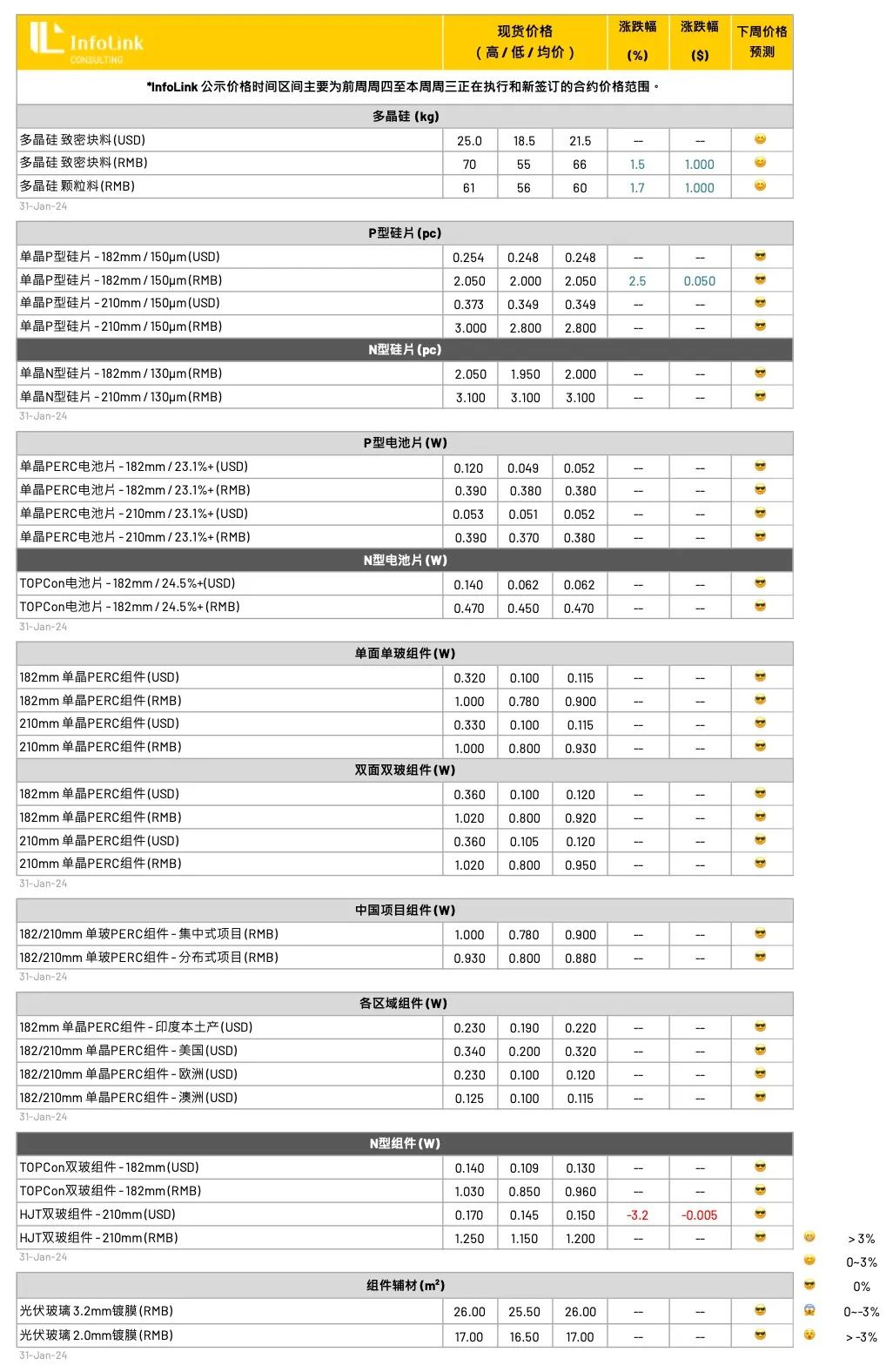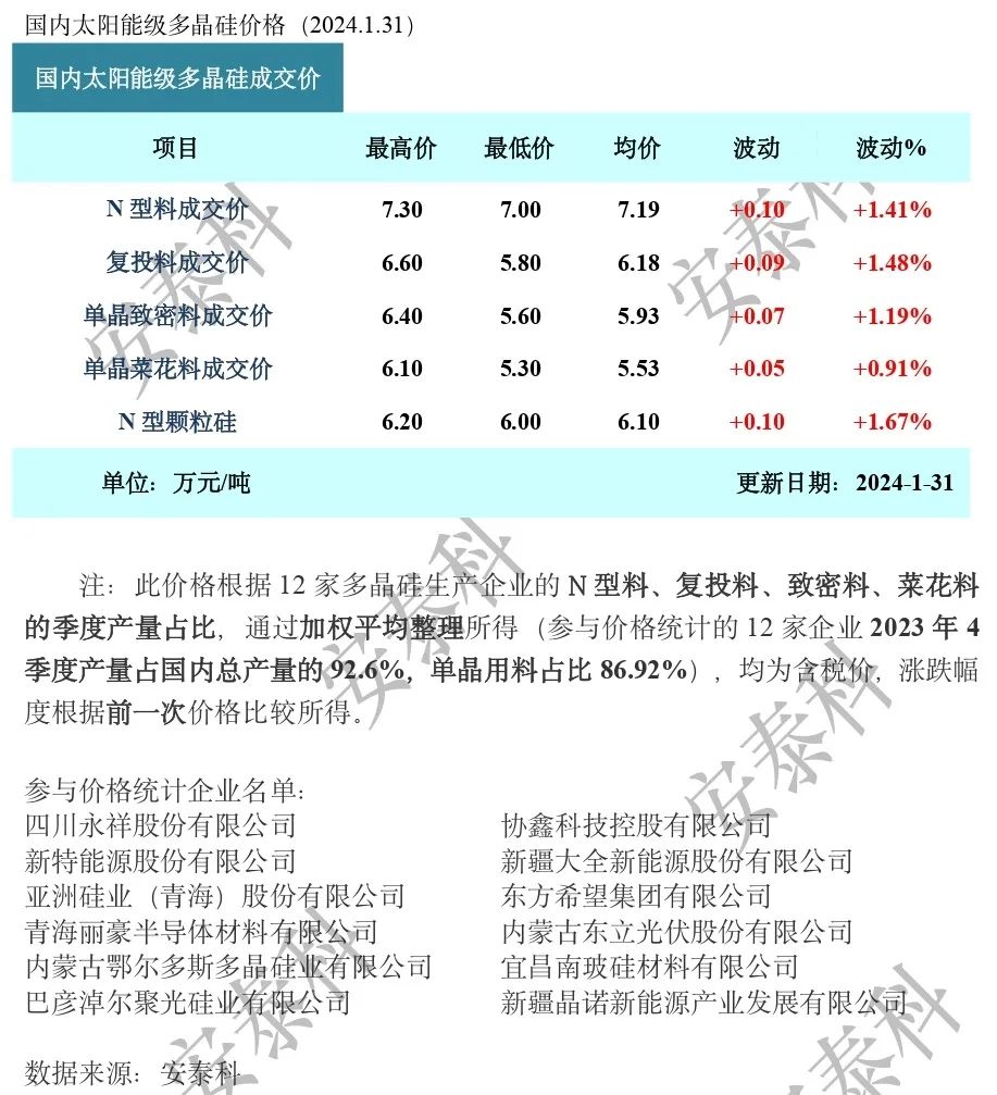 而海外部分,考虑到 182PERC 组件已位于产品周期尾部,短期海外需求有出现上升趋势,且欧洲去库加快、航运等变动因素影响,部分厂家规划节后调整价格,但整体涨价幅度仍将受制终端接受度而定,或许涨幅仅1-2美分左右的调整。