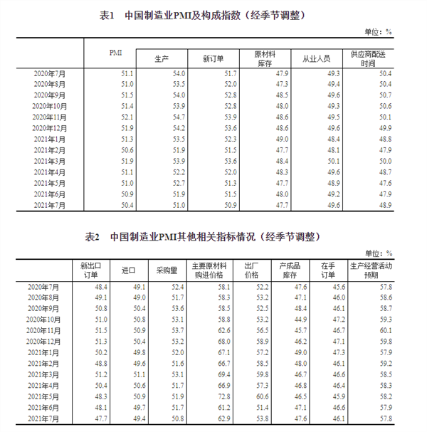2021年7月中国采购经理指数运行情况