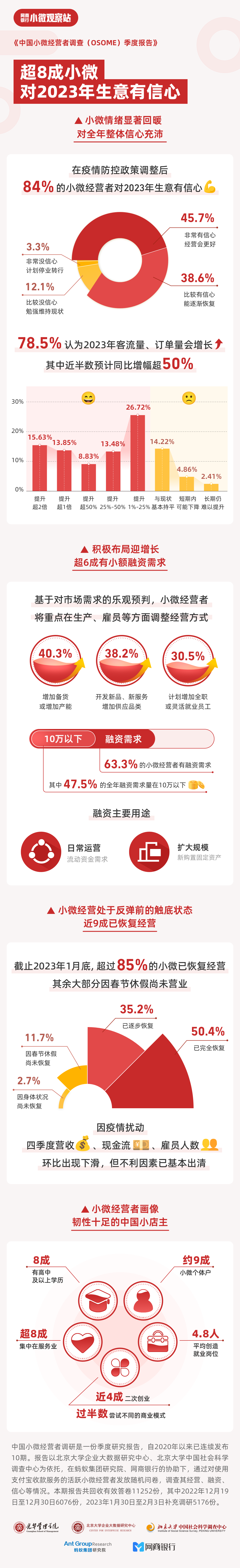 近日,由北京大学光华管理学院、北京大学企业大数据研究中心、北京大学中国社会调查研究中心、蚂蚁集团研究院和网商银行小微观察站共同发起的《中国小微经营者调查》,发布了最新一期数据报告,2023年开年调研显示,在疫情防控政策调整后,小微群体信心显著回暖: