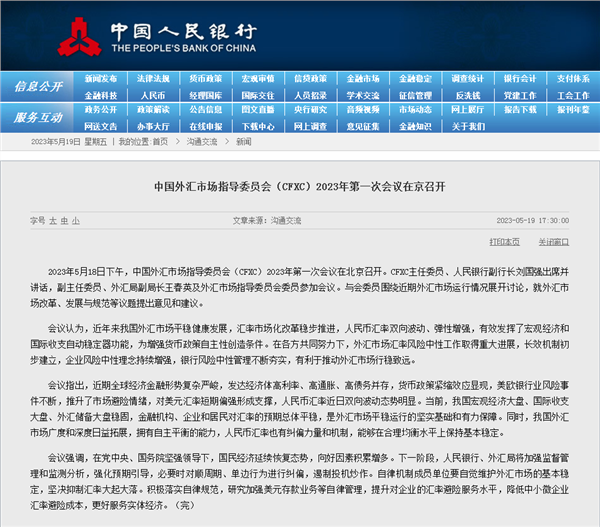 5月19日,人民银行发布消息称,中国外汇市场指导委员会(CFXC)2023年第一次会议18日下午在北京召开。与会委员围绕近期外汇市场运行情况展开讨论,就外汇市场改革、发展与规范等议题提出意见和建议。