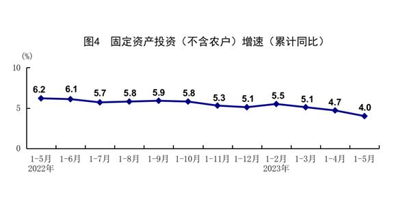 1-5月份,全国固定资产投资(不含农户)188815亿元,同比增长4.0%,比1-4月份回落0.7个百分点。分领域看,基础设施投资同比增长7.5%,制造业投资增长6.0%,房地产开发投资下降7.2%。全国商品房销售面积46440万平方米,同比下降0.9%;商品房销售额49787亿元,增长8.4%。分产业看,第一产业投资同比增长0.1%,第二产业投资增长8.8%,第三产业投资增长2.0%。民间投资下降0.1%。高技术产业投资同比增长12.8%,其中高技术制造业和高技术服务业投资分别增长12.8%、13.0%。高技术制造业中,医疗仪器设备及仪器仪表制造业、电子及通信设备制造业投资分别增长18.8%、16.1%;高技术服务业中,科技成果转化服务业、专业技术服务业投资分别增长47.4%、40.6%。5月份,固定资产投资(不含农户)环比增长0.11%。