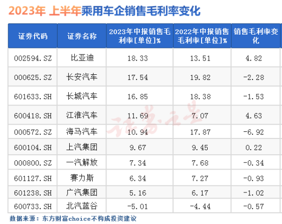 从图中我们可以看到,除了比亚迪、江淮汽车、上汽集团外,多数乘用车企业销售毛利率下滑。