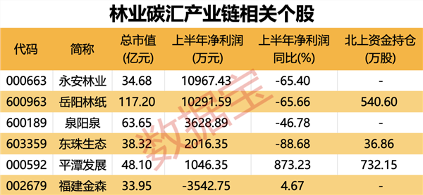据证券时报·数据宝不完全统计,A股市场中,约有6股为林业碳汇产业链相关标的。其中,岳阳林纸是唯一市值过百亿的上市公司,最新总市值117.2亿元;泉阳泉随后,总市值63.65亿元。