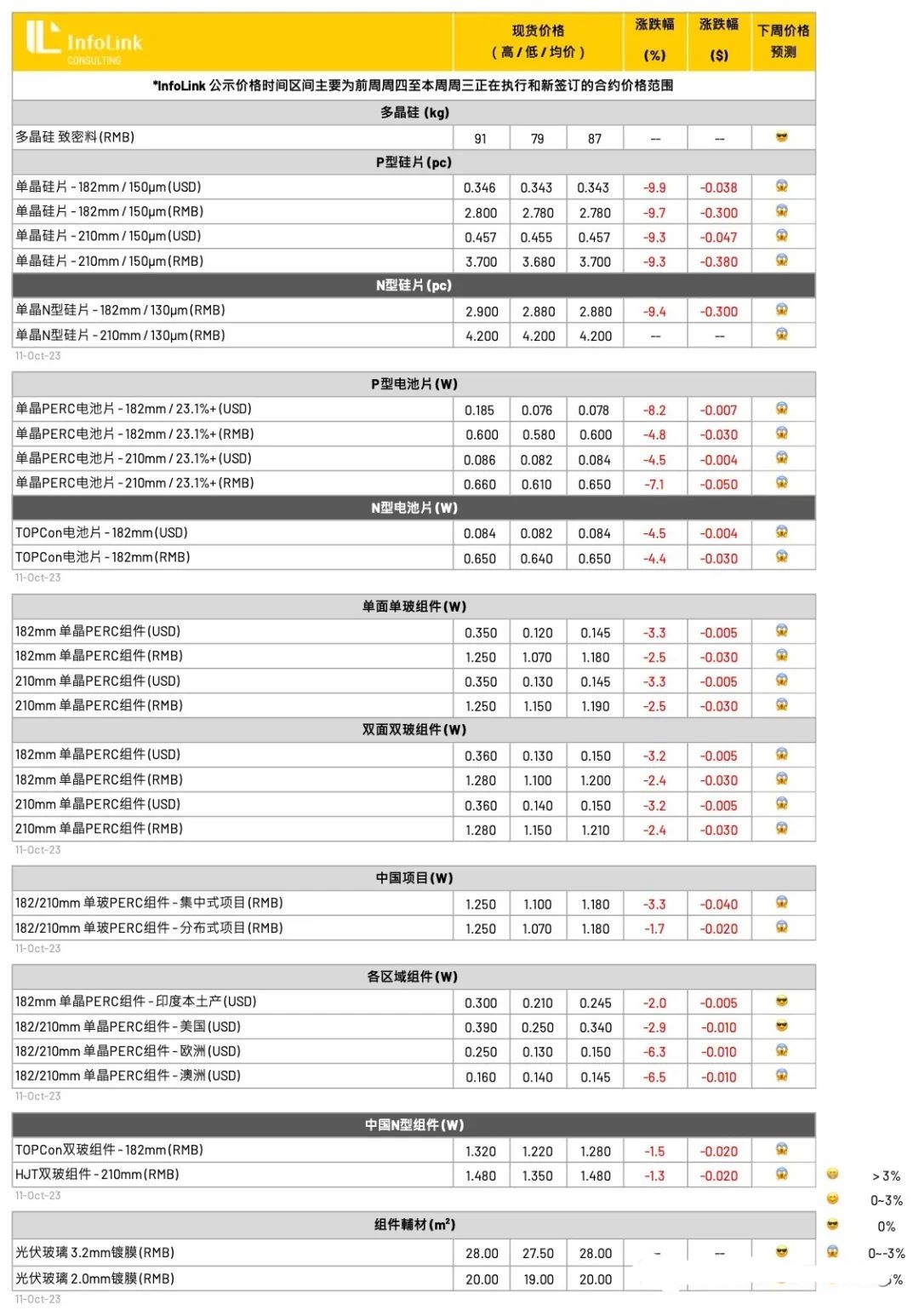 本周为双节过后第一次询价,并未出现预期的集中签单,仍以执行前期订单为主。目前企业前期订单基本在本月月中能够执行完毕,但上下游议价困难加大,下游企业观望态度明显,新单磋商难度有所增加。本周N型、P型硅料各有3家企业成交,成交数量普遍较小,成交价格均有不同幅度的下调,高价订单基本已经消失,几家龙头企业成交价格持稳,其余厂家成交价轻微松动。
