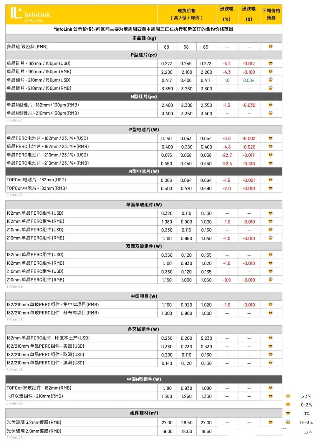 这周组件价格暂时稳定,主要因为海内外项目开始收尾渐入淡季。本周市场价格差距仍十分明显,厂家策略分化不同,考虑明年一月签单尚未满单,部分厂家在手订单不足,已有厂家考虑以成本水平作为基准点。182 PERC单面组件价格约每瓦0.9-1.03元人民币,新签价格靠向每瓦0.92-0.93元人民币,少量已经开始谈0.9以下。现货表并不呈现非常规出货,目前仍在陆续销售,现货售价约每瓦0.7x-0.8x元人民币不等。210 PERC单面组件暂时价格坚挺,目前价格每瓦1.03-1.1元人民币,新签价格靠向每瓦0.95-1元人民币,与182之间的价差随着订单收尾后逐渐收窄,预期接下来价格将逐渐与182接近。