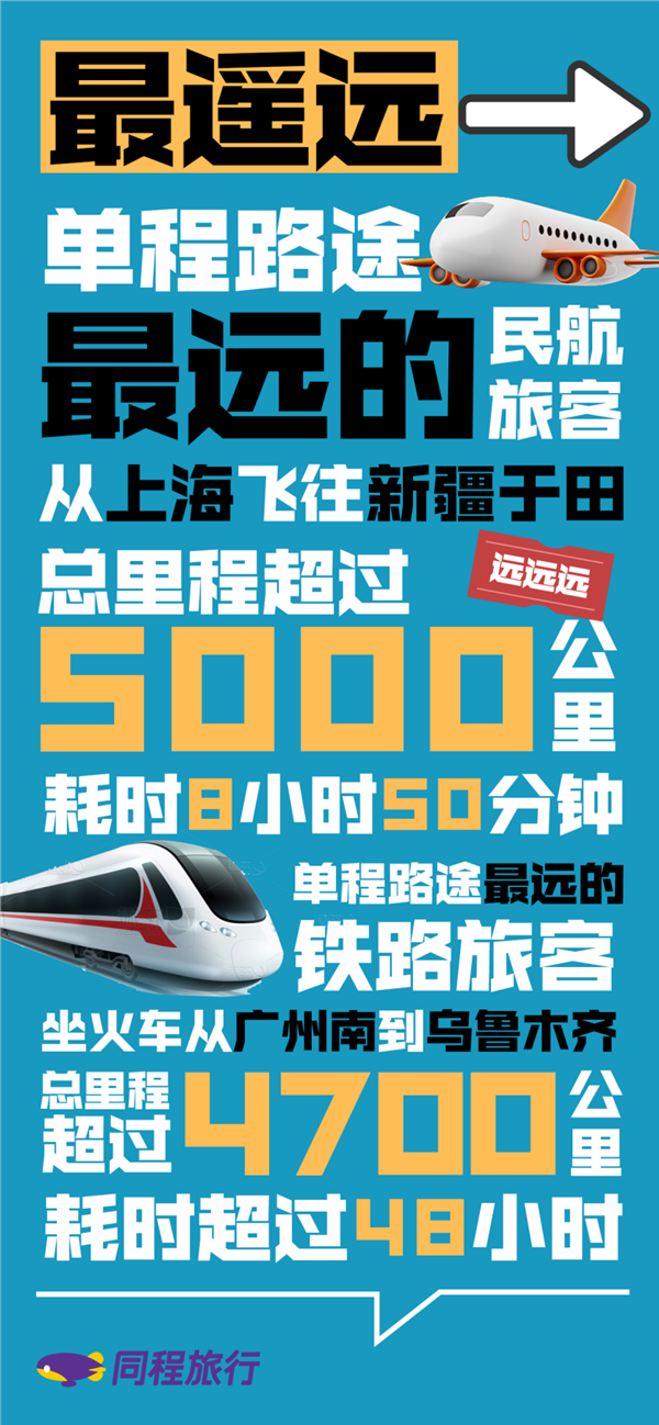 同程旅行平台上,国内单程旅途最遥远的国内民航旅客,从上海飞往新疆于田,总里程超过5000公里,耗时8小时50分钟;而单程路途最远的铁路旅客坐车从广州前往乌鲁木齐,总里程超过4700公里,耗时超过48个小时,需要在火车上渡过2天2夜。