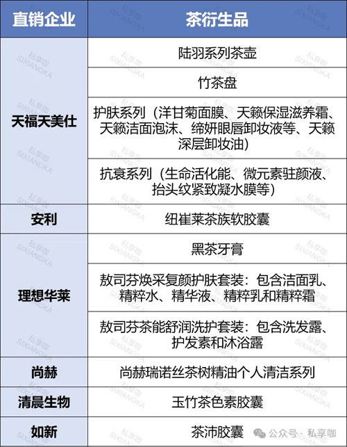 据不完全统计,共有16家直销企业推出了多款茶产品,可分为原茶、茶饮和茶衍生品三大类别。