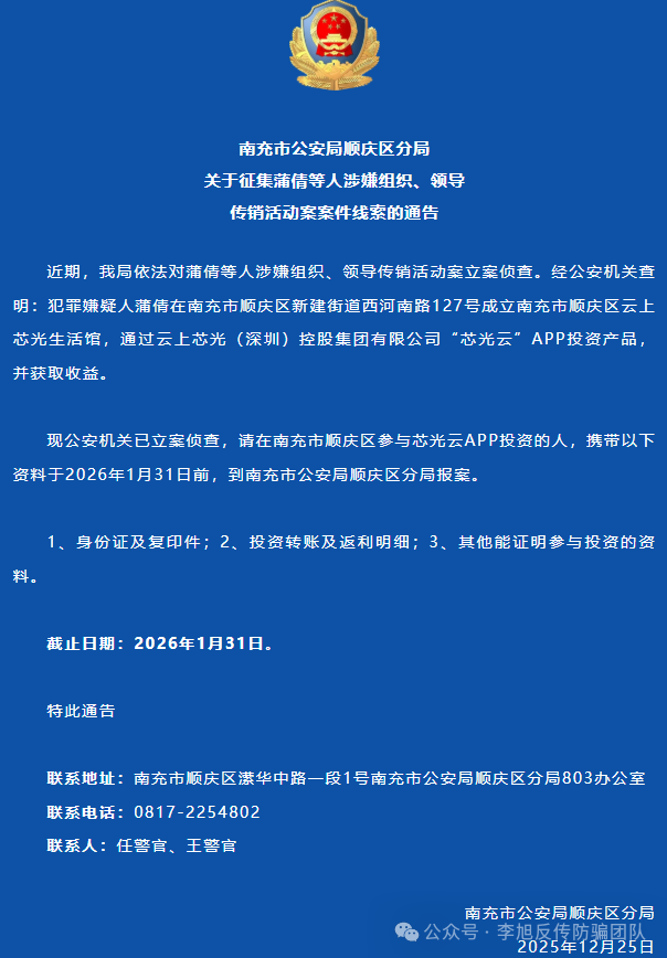 南充警方:关于征集蒲倩等人(芯光云APP)涉嫌组织、领导传销活动案案件线索的通告