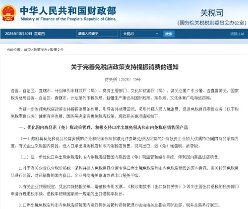 更具备突破性的是10月29日,财政部、商务部、文化和旅游部、海关总署、税务总局五部门联合推出的免税新政《关于完善免税店政策支持提振消费的通知》,规定从11月1日起完善免税店政策,随后市场监管总局也宣布推动体现中华优秀传统文化的特色优质保健食品首次纳入免税店经营品类,涵盖口岸出境免税店、口岸进境免税店及市内免税店。